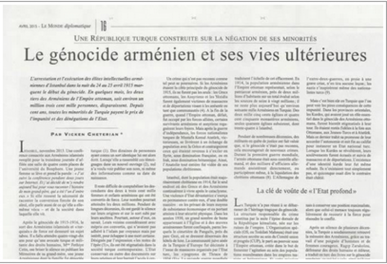 ՀասարակությունՄիջազգային անցուդարձը լուսաբանող ֆրանսիական ամենահեղինակավոր «Le Monde Diplomatique» ամսագրի ապրիլյան համարում հրապարակվել է«Հայոց ցեղասպանությունը և դրա հետագա կյանքերը. Փոքրամասնությունների ժխտման վրա հիմնված թուրքական պետականություն» վերնագրով հոդված՝ քաղաքական վերլուծաբան Վիգեն Չետերյանի հեղինակությամբ: «Արմենպրես&raqu o;-ի հաղորդմամբ` հոդվածն անդրադառնում է Հայոց ցեղասպանության հետևանքով Թուրքիայի դեմոգրաֆիկ փոխակերմանը և հետագա տասնամյակներում ազգային փոքրամասնությունների առկայության իսպառ ժխտմանը:Հոդվածում ասվում է, որ Կայսրության տապալումից հետո նոր ստեղծված հանրապետությունը շարունակել է փոքրամասնություններից ձերբազատվելու քաղաքականությունը և ներկայիս Թուրքիայի հիմնաքարը հենց այդ քաղաքականության շարունակականությունն է. «Պատերազմի ավարտին, երբ պարտված Օսմանյան կայսրությունը, նվաճվեց Միացյալ ուժերի կոզմից, հայ և ասորի փրկվածների մի որոշ հատված վերադարձավ իրենց օջախներ: Սակայն անկախության պատերազմից հետո հաղթանակած Աթաթուրքի ազգայնական ուժերը նախ իրագործեցին Հունաստանի հետ բնակչության փոխանակում, ապա ստիպեցին վերադարձածներին աքսորվել ֆրանսիական տիրապետության ներքո գտնվող Սիրիա կամ բրիտանական Իրաք: Այսպես Անատոլիան ամբողջությամբ դատարկվեց քրիստոնյա բնակչությունից»: Հոդվածում որպես նույն քաղաքականության շարունակությունն է նաև նշվում քրիստոնյա բնակչության դեմ որպես գործիք օգտագործված քրդերի հանդեպ Աթաթուրքի «դավաճանությունը»՝ վերջիններիս ազգային փոքրամասնության կարգավիճակի մերժմամբ, որի նպատակն էր քրիստոնյաներից «ազատված» հանրապետության տարածքում ապրող բոլոր մահմեդական էթնիկ խմբերից միացյալ թուրք ժողովուրդ ստեղծելը: