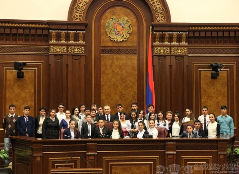 Հանդիպման ավարտին աշակերտները լուսանկարվել են ԱԺ լիագումար նիստերի դահլիճում: