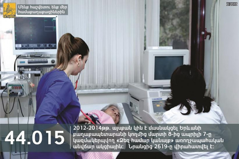 ՀասարակությունԵրևանի քաղաքապետարանի գործունեության թափանցիկության բարձրացման համատեքստում քաղաքապետարանի աշխատակազմի տեղեկատվության և հասարակայնության հետ կապերի վարչությունը շարունակում է «Օրվա փաստը» խորագրի ներքո ներկայացնել Երևանի քաղաքապետարանի կողմից իրականացված աշխատանքները: Այս անգամ ներկայացնում ենք 2012-2014թթ. ընթացքում «Ձեզ համար կանայք» առողջապահական մեկամսյակի շրջանակում անվճար ակցիային մասնակից կանանց քանակը: