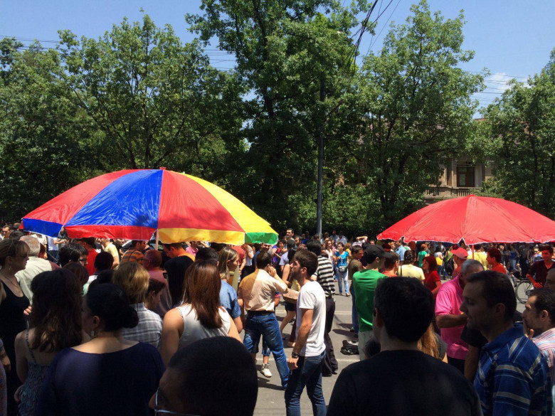 ՀասարակությունԲաղրամյան պողոտայում ցուցարարները հովանոցներ են տեղադրել: Ոստիկանությունը չի առարկել 5-6 հովանոցի տեղադրման փաստին: Ոստիկանական պատնեշն էլ հետ է քաշվել. ոստիկանների փոխարեն Բաղրամյան պողոտայում ճաղավանդակներ են տեղադրվել: Ցուցարարները նաև ժապավեններով ազատ տարածություն են թողել պողոտայի կենտրոն բերված աղբամանների և հավաքի մասնակիցների միջև: Նախ, ոստիկանությունը մտավախություն ուներ, որ աղբամաններում կարող են պահվել պարկերով քարեր` չնայած ստուգումները ցույց տվեցին, որ աղբամաններում միայն շինարարական աղբ է: Երկրորդ, աղբամանների հոտը կիզիչ արևի տակ տարածվում է: