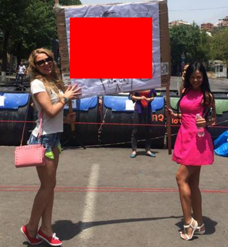 Սանկտ-պետերբուրգցի աղջիկները Բաղրամյան պողոտայում՝ «Վարդակս ուտեք» պաստառով: