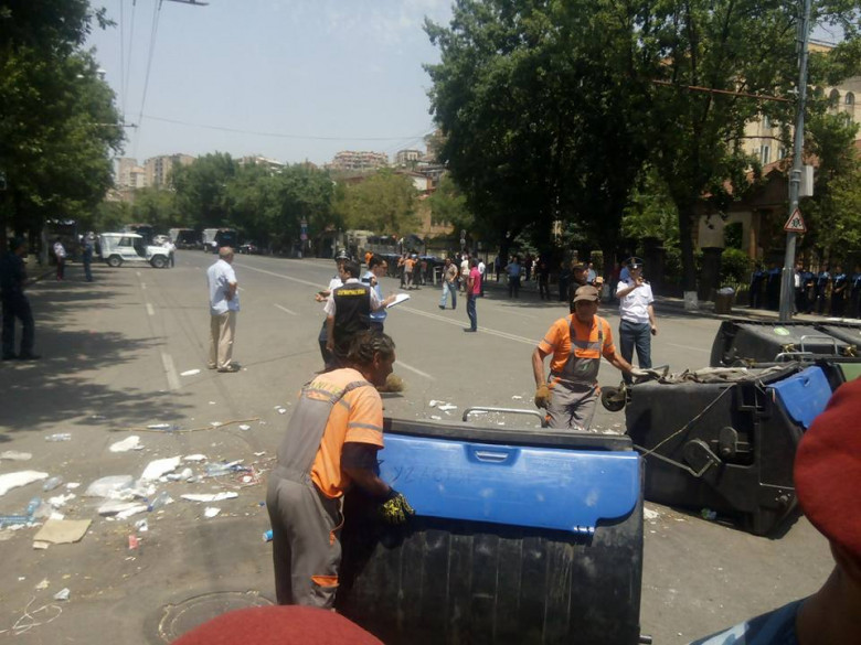 Ոստիկանությունը հեռացնում է աղբամանները Բաղրամյան պողոտայից