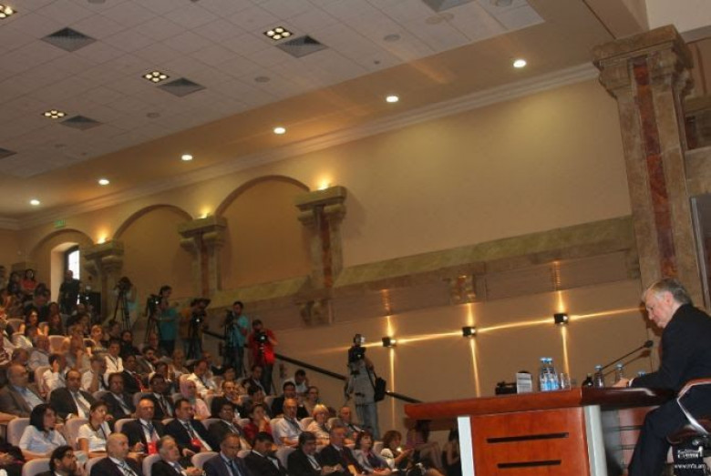 Ողջունում եմ համաժողովի բոլոր մասնակիցներին և մաղթում բարի գալուստ մեր երկրի հյուրերին: Հատկանշական է, որ այս խորագրի ներքո թվով երրորդ խորհրդաժողովը համընկնում է Միավորված ազգերի կազմակերպության և նրա հատուկ գործակալության՝ ՅՈՒՆԵՍԿՕ-ի հիմնադրման 70-ամյակի հետ, որի շրջանակներում իրականացվող միջոցառումները լավագույն հնարավորություն են` ամփոփելու անցած յոթ տասնամյակների ձեռքբերումները, նախանշելու ներկայիս մարտահրավերներն ու հնարավոր լուծումները: Ստեղծվելով երկրորդ աշխարհամարտից հետո և հաշվի առնելով նաև այդ սարսափելի պատերազմի դասերը՝ այս միջազգային կազմակերպություններն իրենց առջև նպատակ դրեցին նպաստել աշխարհում խաղաղության ամրապնդմանը, համամարդկային արժեքների առաջ մղմանը: