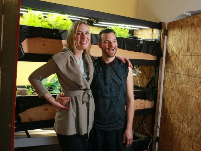 Local Input~ Gavin Young, Calgary Herald CALGARY, AB: MAY 08, 2014 -- Julie Phillips and Geoff Szuszkiewicz are two Calgarians on a mission called buy nothing year -- they're not buying anything other than food, shelter and transportation basics for one year. In the process both have saved a lot of money and learned a lot about what they really want from work. They were photographed in front of the Szuszkiewicz's  aquaponics system in his Calgary kitchen. Gavin Young/Calgary Herald  (For Michelle Lang Project section story by Jessica Barrett) Trax# 00055050A ORG XMIT: POS2014073113183178