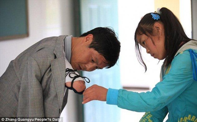 Ջիանգ Շենգֆան, ով կորցրել է իր երկու ձեռքերը 1996թ․-ին էլեկտրական շոկի հետևանքով, դասավանդում է փոքրիկ գյուղի դպրոցում արդեն 12 տարի։