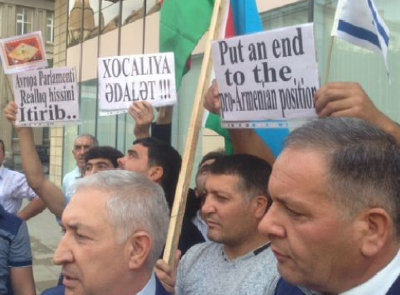 Բողոքի ակցիայի մասնակիցները բողոքել են Եվրոպայի «հայամետ» քաղաքականության դեմ` մեղադրելով ԵՄ-ին և Եվրախորհրդարանին երկակի ստանդարտների և հակաադրբեջանական քաղաքականության մեջ:
