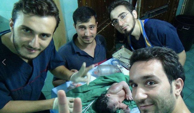 Սիրիական Հալեպ քաղաքի հրթիռակոծության ժամանակ հղի մի կին վիրավորվեց և շտապ տեղափոխվեց հիվանդանոց։ Հղիության 8–րդ ամսում գտնվող կինը վաղաժամ ծննդաբերեց։ Ծնունդն ընդունող բժիշկները շոկի մեջ էին, երբ տեսան, որ հրթիռակոծության արդյունքում վիրավորված մորից բեկորն անցել էր նաև երեխային։ Այն դիպել էր փոքրիկի գլխին։