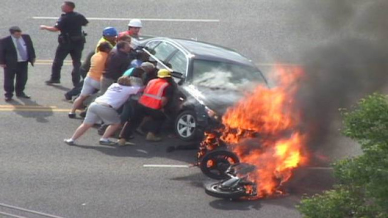 Որքան էլ աշխարհը մութ լինի, բազմաթիվ լավ մարդիկ կան, ովքեր պատրաստ են իրենց կյանքը վտանգել հանուն մեկ այլ մարդու փրկության, նույնիսկ եթե նա անծանոթ է։ Վերը  նշված լուսանկարում երևում է, թե ինչպես են անցորդները հերոսաբար փրկում անգիտակից մոտոցիկլավարին կրակի միջից։