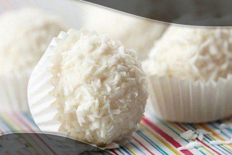 • Արդեն սառչած զանգվածից պատրաստում ենք փոքրիկ գնդիկներ (համաչափ գնդիկներ ստանալու համար կարելի է օգտագործել թեյի գդալ), մեջը տեղադրում նուշի մեկական հատիկ և թաթախում ստացված գնդիկները նախապես առանձնացված կոկոսի քերուկի մեջ: