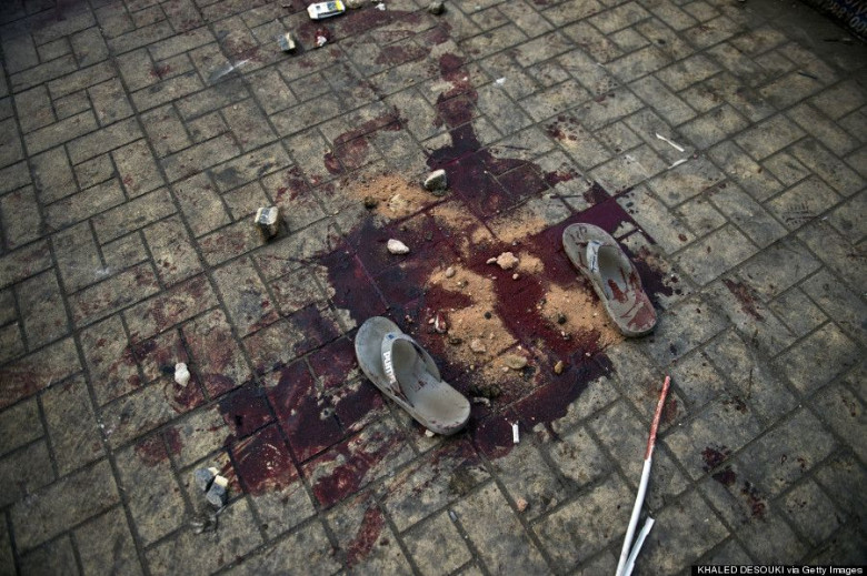 Արյան հետքերն ու հողաթափերը Տահրիր հրապարակում, որտեղ տեղի են ունեցել եգիպտական խռովությունները իսլամիստ նախագահ Մուհամեդ Մորսիի կողմնակիցների ու եգիպտական ռազմական ուժերի միջև: