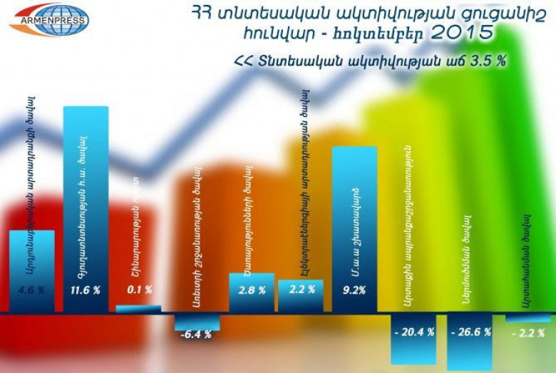 ՏնտեսությունՀայաստանի տնտեսական ակտիվության ցուցանիշը 2015 թվականի հունվար-հոկտեմբերին 3,5 տոկոսով գերազանցել է նախորդ տարվա նույն ժամանակահատվածի ցուցանիշը: ՀՀ ազգային վիճակագրական ծառայությունը ներկայացրել է երկրի սոցիալ-տնտեսական վիճակը բնութագրող ընթացիկ-օպերատիվ ամփոփմամբ ստացված նախնական հիմնական մակրոտնտեսական ցուցանիշները: Անկում են գրանցել առևտրի շրջանառության, արտաքին առևտրաշրջանառության ոլորտները: