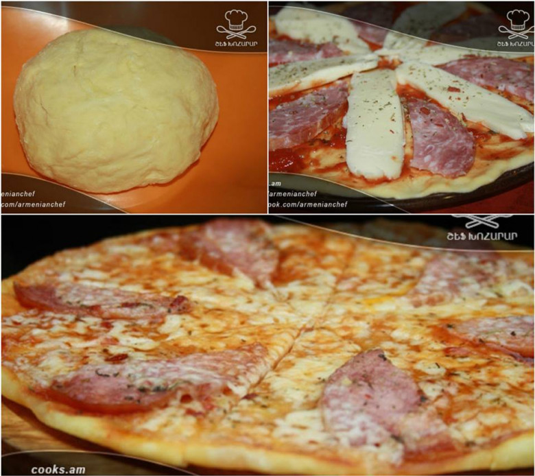 Այս քանակության մթերքից ստացվում է 2 համեղ պիցցա: Ցանկության դեպքում պիցցայի բաղադրիչների մեջ կարելի ավելացնել պահածոյացված շանպինյոն