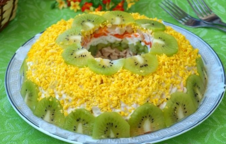 Մատուցվող ամանի կենտրոնում բաժակ դնել։ Առաջին շերտով բաժակի շուրջ լցնել հավի միսը, կիվին, ավելացնել մայոնեզը, որի մեջ նախօրորք պետք է ճզմել սխտորը։