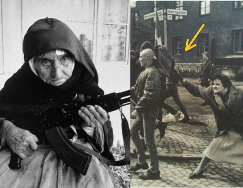 2  Շվեդ կինը պայուսակով հարվածում է նեոնացիստ ցուցարարի գլխին։ Շվեդուհին համակենտրոնացման ճամբարը վերապրածներից է, 1985թ․։