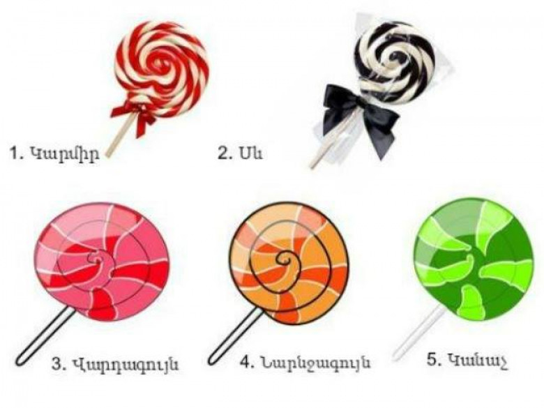 Ընտրեք նկարում պատկերված կոնֆետներից ցանկացած մեկը, որը Ձեզ առավել է դուր գալիս, ու ծանոթացեք արդյուքներին։ Կարևոր նախապայման է, որ ընտրություն կատարեք ոչ թե գունային նախասիրություններով ու տրամաբանությամբ, այլ ներքին իմպուլսով։