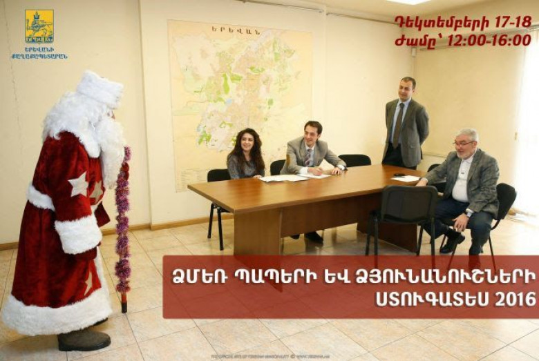 Ինչպես տեղեկացրին Երևանի քաղաքապետարանի տեղեկատվության և հասարակայնության հետ կապերի վարչությունից, դեկտեմբերի 17-ին և 18-ին ցանկացողները կարող են դիմել Երևանի քաղաքապետարանի աշխատակազմի մշակույթի և տուրիզմի վարչություն: