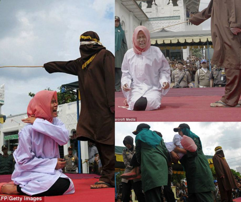 The woman was forced to endure the punishment after breaking the regions strict Sharia law on being to close to a man she was not married to After being brought to the stage as the crowd cheered, the woman was forced to kneel down while a masked man repeatedly whipped her with the caneHundreds of people gathered outside the mosque in Banda Aceh to watch the caning, with some spectators holding up cameras