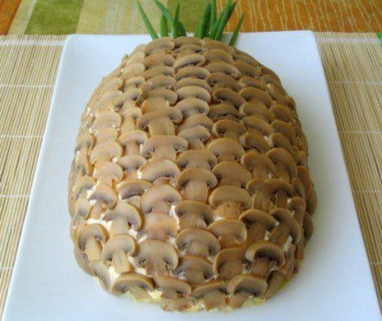 Ափսեի մեջ արքայախնձորի ձևով դասավորել հետևյալ շերտերը և յուրաքանչյուր շերտը մայոնեզով խառնել: Գազար, խոզապուխտ, եգիպտացորեն, ձու, իսկ վերևի շետում միայն սունկը դասավորել առանց մայոնեզով խառնելու, կանաչ սոխից արքայանխնձորի տերևիկների նման ձև ստանալ: