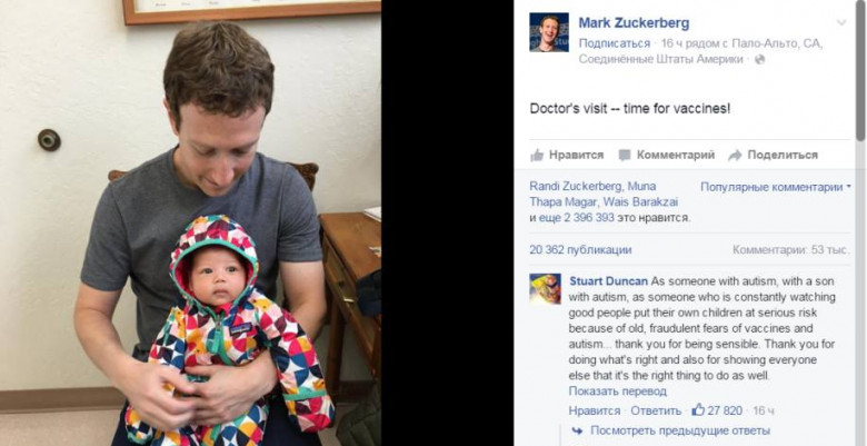 «Ֆեյսբուք» սոցիալական ցանցի հիմնադիր Մարկ Ցուկերբերգն իր էջում տեղադրել է իր և որդու լուսանկարը հետևյալ գրառմամբ. «Այցելություն բժշկին: Պատվաստանյութեր ընդունելու ժամանակն է»,- գրում է Orer.am-ը: