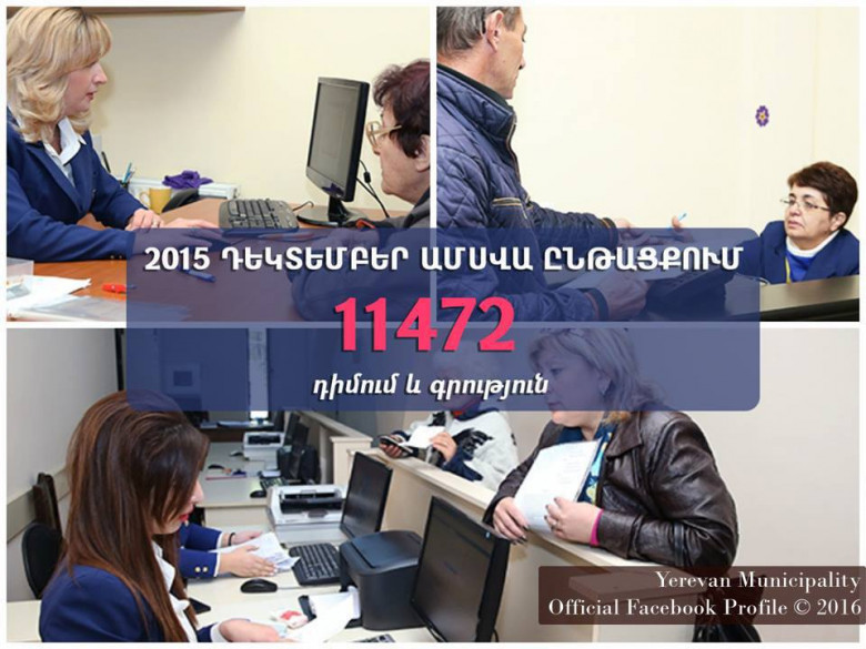 ՀասարակությունԵրևանի քաղաքապետարանի և վարչական շրջանների ղեկավարների աշխատակազմեր քաղաքացիներից ու իրավաբանական անձանցից 2015թ. դեկտեմբեր ամսվա ընթացքում ստացվել է 11472 դիմում և գրություն: Այդ առնչությամբ տրվել են հանձնարարականներ` ՀՀ օրենսդրությամբ սահմանված ժամկետներում դիմումներում և գրություններում բարձրացված հարցերին պատշաճ լուծում տալու, իսկ եթե դրանք քաղաքապետարանի կամ վարչական շրջանների լիազորություններից դուրս են, ապա քաղաքացիների դիմում-գրությունները համապատասխան իրավասու կառույցներին վերահասցեագրելու նպատակով: Դիմում-գրություններին համապատասխան ընթացք տալու ժամկետների ոչ մի խախտում չի արձանագրվել: