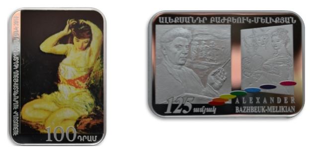 «Ալեքսանդր Բաժբեուկ-Մելիքյան-125» հուշադրամի դիմերեսին պատկերված է Ա.Բաժբեուկ-Մելիքյանի «Լիդան բարձրացրած ձեռքերով» կտավը: Հուշադրամի դարձերեսին պատկերված են Ա.Բաժբեուկ-Մելիքյանի «Ինքնադիմանկար» և «Կանայք» կտավները: Անվանական արժեքը 100 դրամ է, մետաղը և հարգը` արծաթ 9250, չափը` 28,0 x 40,0 մմ, քաշը` 28,28 գ, որակը` լավացված, դրամաշուրթը` հարթ: Տպաքանակը` 500 հատ: Էսքիզների հեղինակը Լուսինե Լալայանն է: Հատվել է Լիտվայի դրամահատարանում: