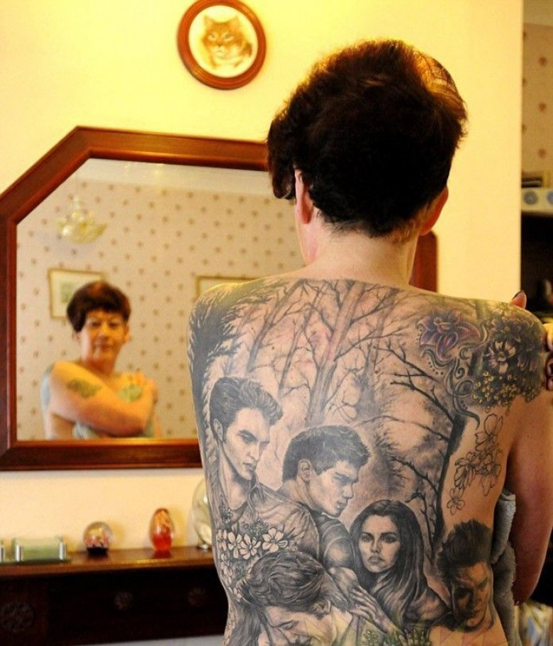 Այս 49-ամյա կնոջը վստահորեն կարելի է համարել «Сумерки» ֆիլմի գլխավոր երկրպագուհին: Կինը այքան է հուզվել, որ ողջ պատումը  նայելիս նիհարել է 7 կգ-ով: Եվ դա դեռ հերիք չի, տեսեք թե ինչ է արել իր մարմնի հետ`