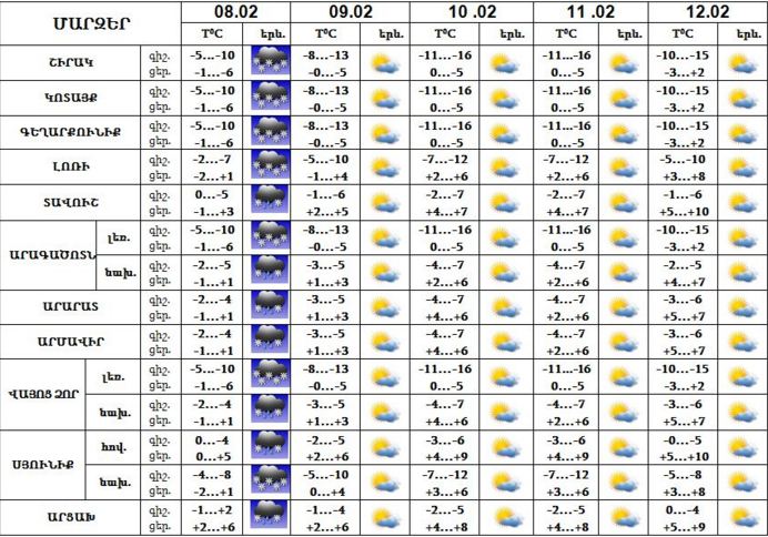Հայաստանի շրջանների մեծ մասում փետրվարի 8-ին սպասվում են տեղումներ