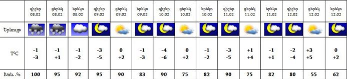 Երևանում փետրվարի 8-ին սպասվում են տեղումներ: 9-12-ին սպասվում է առանց տեղումների եղանակ: