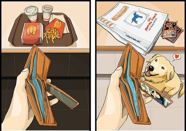 Եթե որոշել եք տանն ընտանի կենդանի պահել, մասնավորապես՝ շուն, ապա այս նկարները ձեզ համար են: Այս ֆոտոշարքում պատկերված է, թե ինչպես է փոխվում կյանքը շուն ունենալուց առաջ և հետո: Այս ֆոտոշարքի հեղինակի խոսքերով, եթե շուն եք ցանկանում տուն բերել, ապա ստիպված հրաժեշտ կտաք սեր սիրելի իրերին, ստիպված կլինեք նրա համար խաղալիքներ գնել և ավելի շատ գումար ծախսել, քան մտածել էիք: