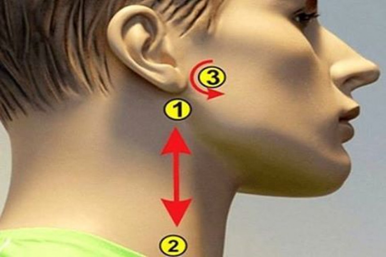 Ուղղահայաց գիծը սկսվում է ականջի բլթակից և ձգվում դեպի պարանոց, ինչպես պատերված է նկարում: Մատերի ֆալանգներով նրբորեն մերսեք այդ հատվածը՝ վերից վար: Գործողությունը կրկնեք 10 անգամ՝ 2 ականջների կողմերից: