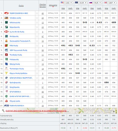 Մեկ դոլարը գնվում է 489. 85 դրամ միջին փոխարժեքով, վաճառվում` 493.93 դրամ միջին փոխարժեքով: Մեկ դոլարի վաճառքի առավելագույն փոխարժեքը 494.50 դրամ է: