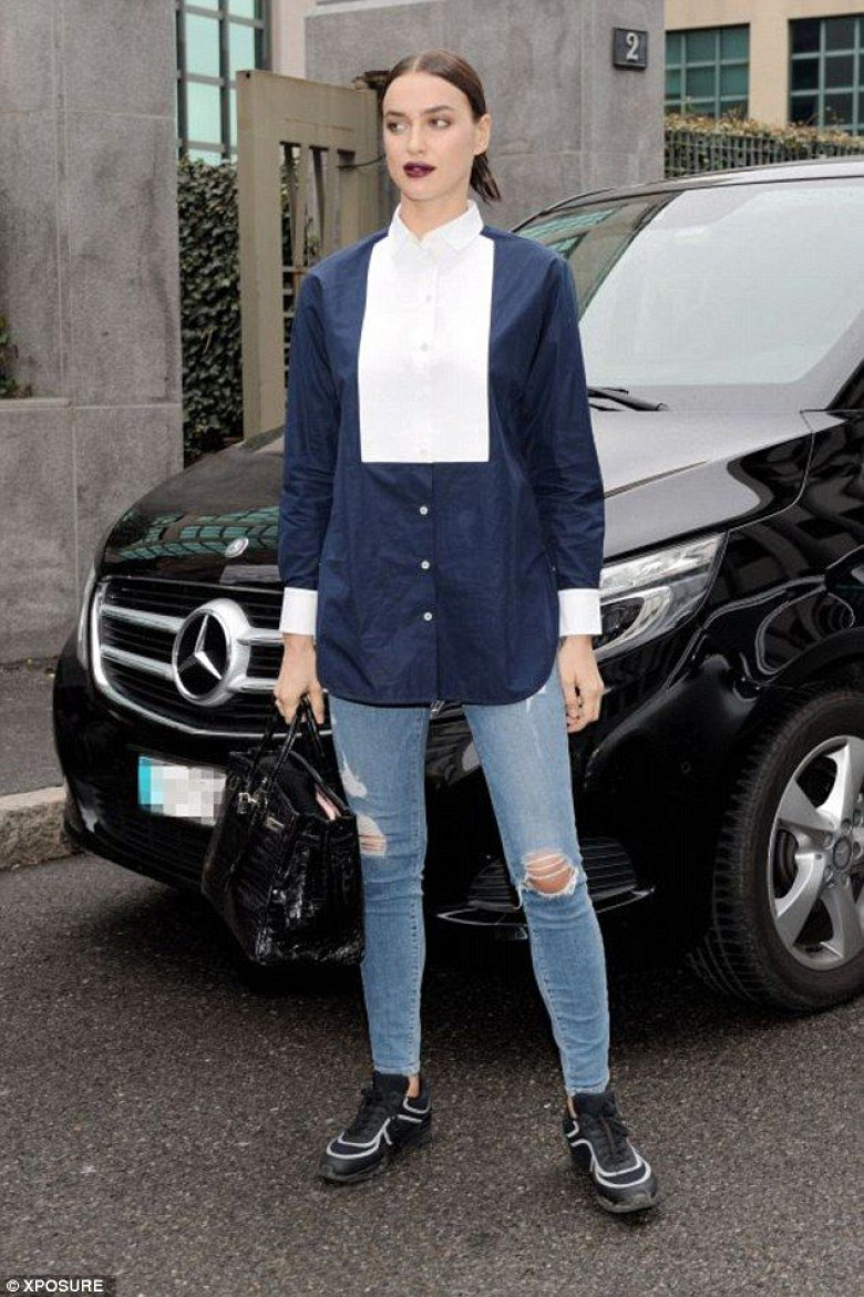 Getting shirty: Rocking the masculine trend, Irina teamed her jeans with an oversized shirt that sheathed her lithe frame. Ever fashion-forward, a plain white panel across the chest gave the garment some pizzazz