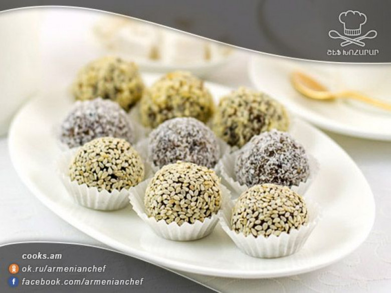 - Թաթախում ենք քունջութի, կոկոսի քերուկի կամ մանրացված ընկույզի մեջ ( կարող եք այդ երեքը խառնել և ընդհանուրի մեջ թաթախել ) ։ Ահա քունջութով պատված կոնֆետները։