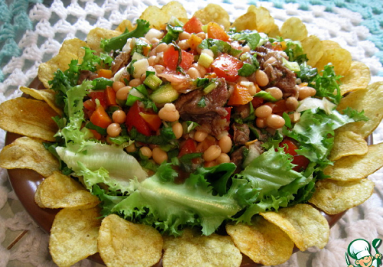 Լցնել մատուցվող ամանի մեջ, ավելացնել տապակած միսը, զարդարձել հազարի տերևներով ու չիպսով։