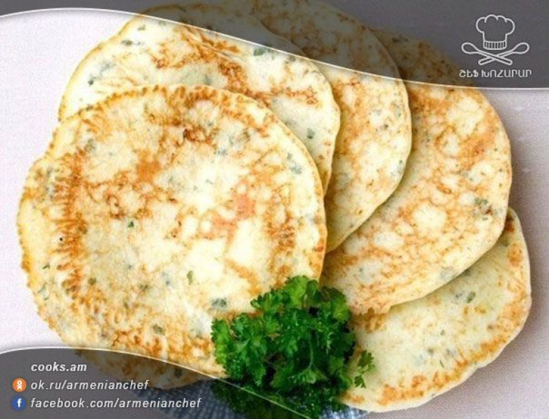 - Պանիրը մանր քերիչով անցկացնում ենք, կանաչին կտրատում ենք և այդ ամենն ավելացնում ենք խմորի մեջ և լավ խառնում։ Թավայի մեջ մի քիչ բուսայուղ ենք տաքացնում, լցնում ենք 2-3 ճ/գդ խմոր և թավայի մակերեսով հավասարեցնում ենք։