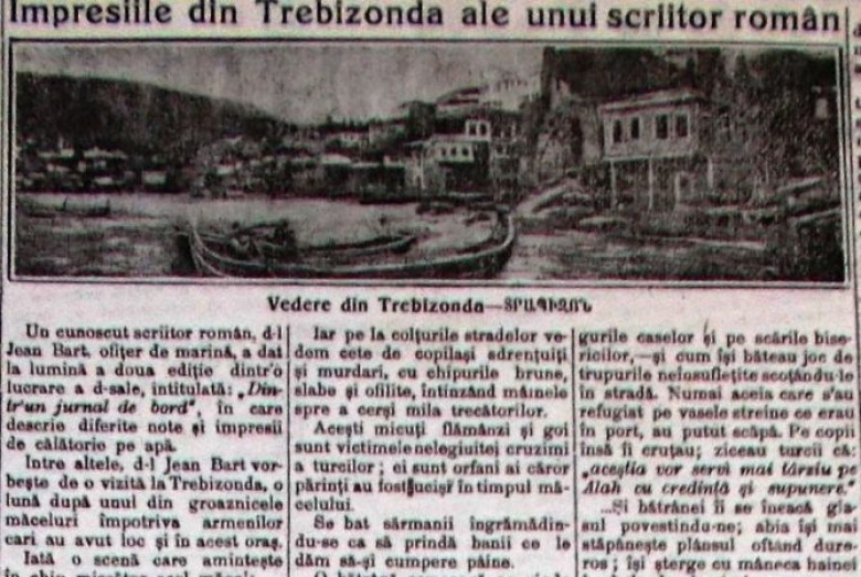«Հայերի սարսափելի սպանությունների» մասին իր տպավորություններն է հաղորդել Սուչավայում ծնված գրող Ժան Բարտը, հետագայում Ռումինական ակադեմիայի թղթակից անդամ: Բարտը 1915թ. եղել է Տրապիզոնում և հավաքել է հրաշքով փրկված հայերի հուշերը: Տարեց մի հայուհի, ջարդված ֆրանսերենով պատմել է, որ թուրքերը խնայել են իր երեխաներին այն մտքով, որ վերջիններս «հետագայում Ալլահին կծառայեն հավատքով ու հնազանդությամբ»:
