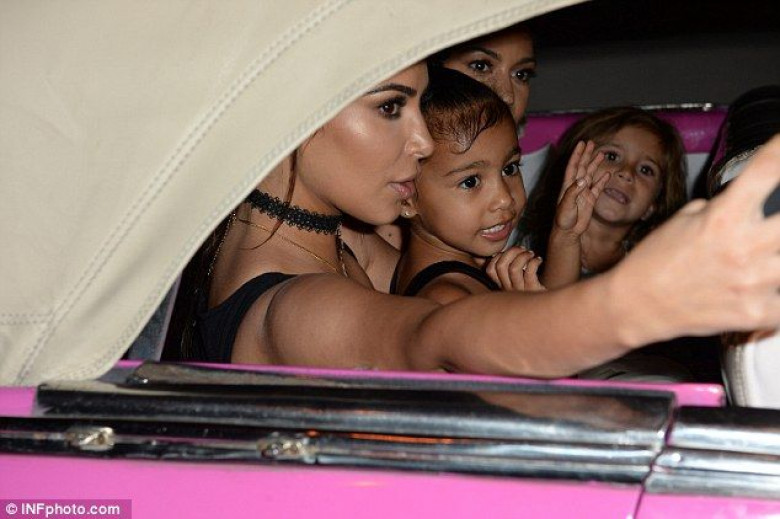 Say cheese!: Kim and Kourtney snapped a selfie with the kids from their hot pink vintage convertible