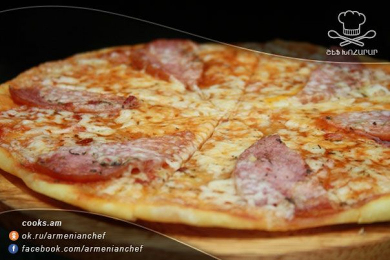 Այս քանակության մթերքից ստացվում է 2 համեղ պիցցա: Ցանկության դեպքում պիցցայի բաղադրիչների մեջ կարելի ավելացնել պահածոյացված շանպինյոն