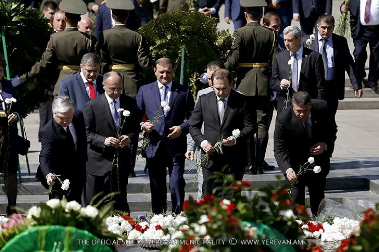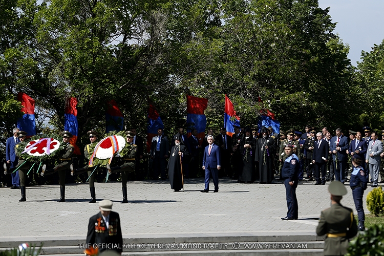 ՀասարակությունՆախագահ Սերժ Սարգսյանը Ն.Ս.Օ.Տ.Տ. Գարեգին Բ Ամենայն Հայոց Կաթողիկոսի հետ, Երևանի քաղաքապետ Տարոն Մարգարյանի, ՀՀ ԶՈւ բարձրաստիճան սպայակազմի, պատերազմի վետերանների, ազատամարտիկների, հասարակական կազմակերպությունների ներկայացուցիչների, պետական բարձրաստիճան պաշտոնատար անձանց, Հայաստանում հավատարմագրված դիվանագիտական կորպուսի ներկայացուցիչների ուղեկցությամբ այցելել է մայրաքաղաքի «Հաղթանակ» զբոսայգի, ծաղկեպսակ է դրել Անհայտ զինվորի հուշահամալիրին, հարգանքի ու երախտագիտության տուրք մատուցել հայրենիքի պաշտպանության և խաղաղության համար իրենց կյանքը զոհաբերած հերոսների հիշատակին: