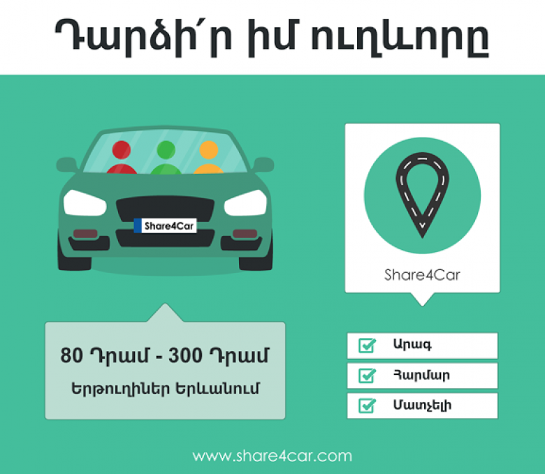 ՀասարակությունShare4Car-ը Հայաստանում նախադեպը չունեցող այլընտրանքային տրանսպորտային համակարգ է, որն իրենից ներկայացնում է առցանց AutoStop: Նպատակը ՀՀ երթևեկությունը, ինչպես նաև միջքաղաքային տրանսպորտը կարգավորելը, թեթևացնելը և ավելի մատչելի դարձնելն է : Գաղափարը հետևյալն է՝ գտնել միևնույն ճանապարհով գնացող մարդկանց և կապել իրար: Անհրաժեշտ է ներբեռնել հավելվածը անմիջապես www.share4car.com –ից, www.ert.am-ից կամ https://play.google.com/store/apps/details?id=com.share4car playMarket-ից գրանցվել որպես ուղևոր, ամրագրել երթուղիներ, օգտվել մեր հարմարավետ, ժամանակ խնայող, անհամեմատ մատչելի երթուղիներից կամ գրանցվել որպես սեփական մեքենայով վարորդ և հեշտությամբ կիսել ճանապարհածախսը, արդյունքում խնայել կյանքում ամենաթանկը՝ ժամանակը և գումարը, որը վաստակելու համար մեզ անհրաժեշտ է ժամանակ: Նշենք նաև, որ ցանկացած ուղևոր, օգտվելով Share4Car-ի երթուղիներից Երևան քաղաքում, վճարում է մինիմալ 80 և մաքսիմալ 300 դրամ: Իսկ Երևան քաղաքից դուրս Share4Car համակարգը երթուղիները հաշվարկում է 1 կմ/12-25 դրամի չափով: Այս գաղափարի մասին սկսել ենք մտածել դեռ 2013թ.-ին, երբ Երևանում անցկացվում էր free car ակցիան: Հենց այդ ժամանակ էլ մտածեցինք՝ ինչու՞ այս ամենը չդարձնենք երթևեկելու հիմնական տարբերակ և ստեղծեցինք Share4car–ը: