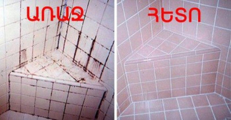 Եթե սալիկները և դրանց արանքները, կարերը շատ կեղտոտ են, քսեք այդ հեղուկը և թողեք այդպես մնա 10 րոպե: Կրկնեք ևս մեկ անգամ և պարզաջրեք: