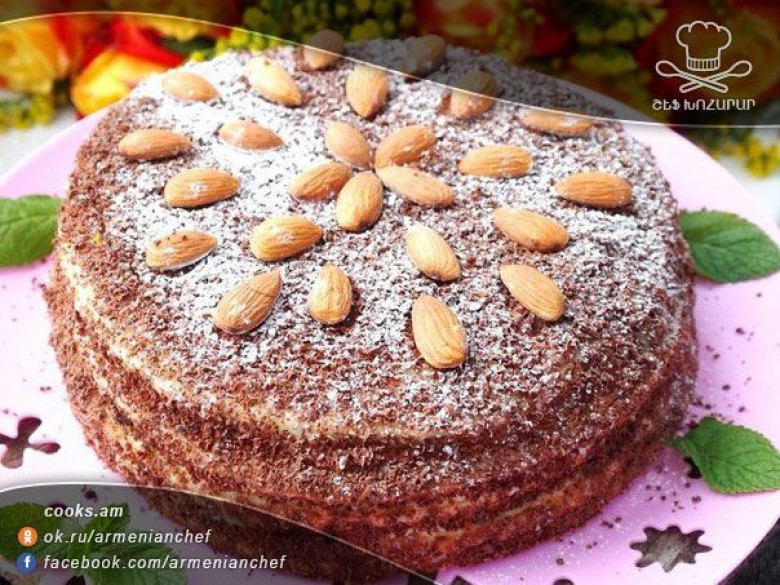 - Պատրաստի տորթը զարդարում ենք քերած շոկոլադով և նուշի հատիկներով, ապա տեղափոխում սառնարան 2 ժամով: