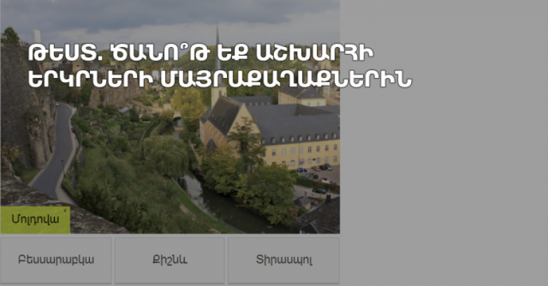 Թեստ. ծանո՞թ եք աշխարհի երկրների մայրաքաղաքներին Lifestyle 8 Հունիս, 2016 23:08 Կիսվել Ընտրե՛ք, թե որն է նշված երկրի մայրաքաղաքը։ Թեստը կարող եք անցնել այստեղ: Կիսվել