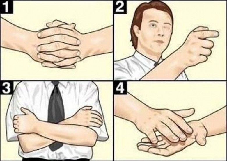 1.Փակեք ձեռքերը կողպեքի նման (ինչպես պատկերված  է 1 նկարում): Եթե վերևում ձախ ձեռքի բթամատն է, ապա թղթի վրա գրեք «Ձ»,  հակառակ դեպքում` «Ա»: