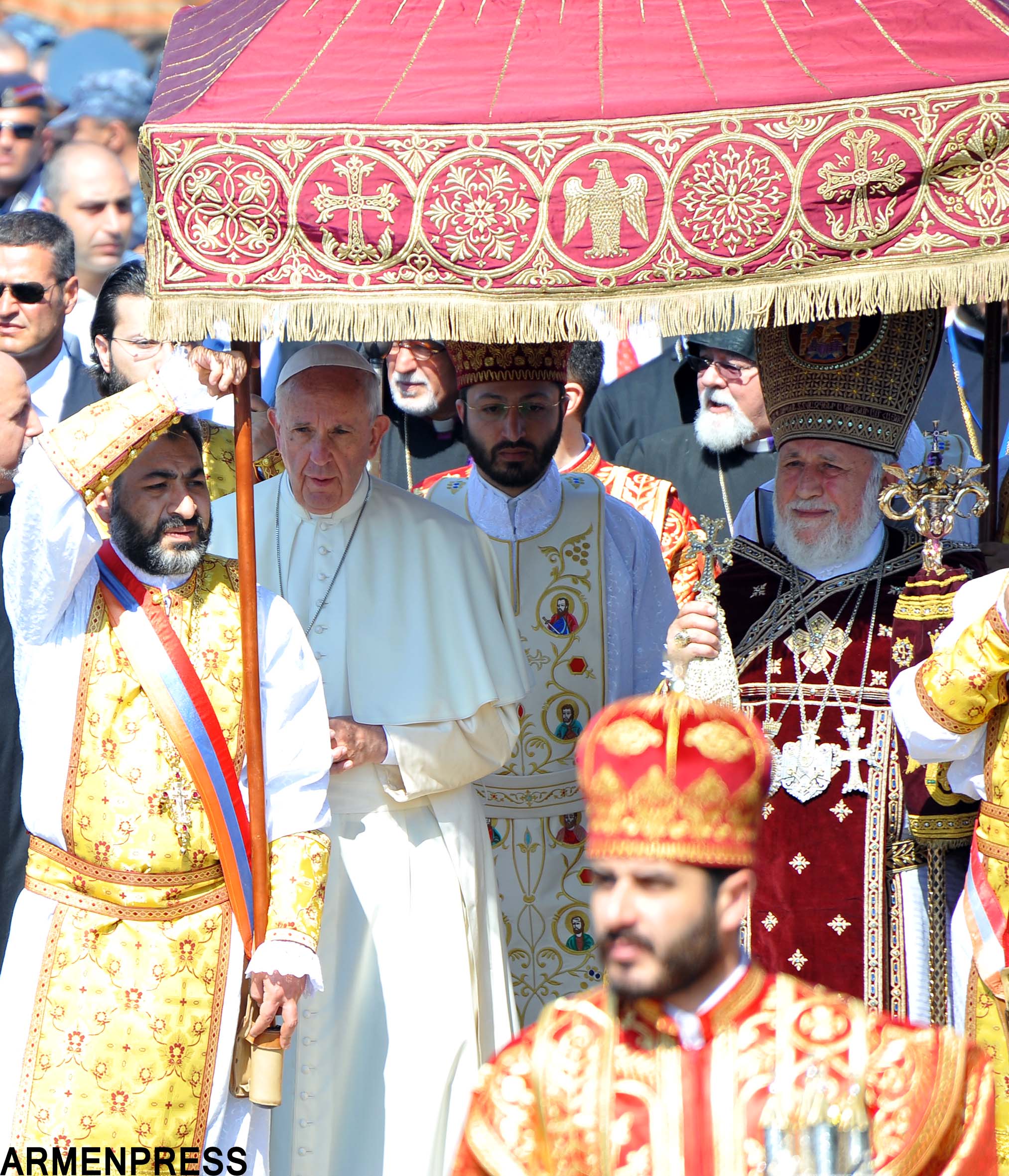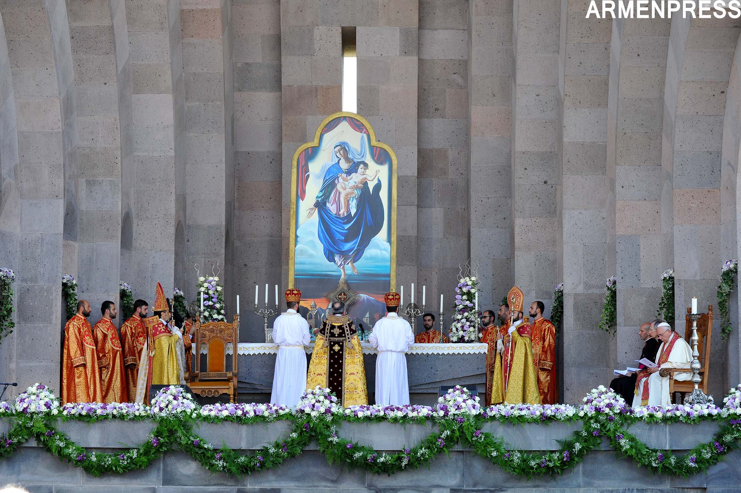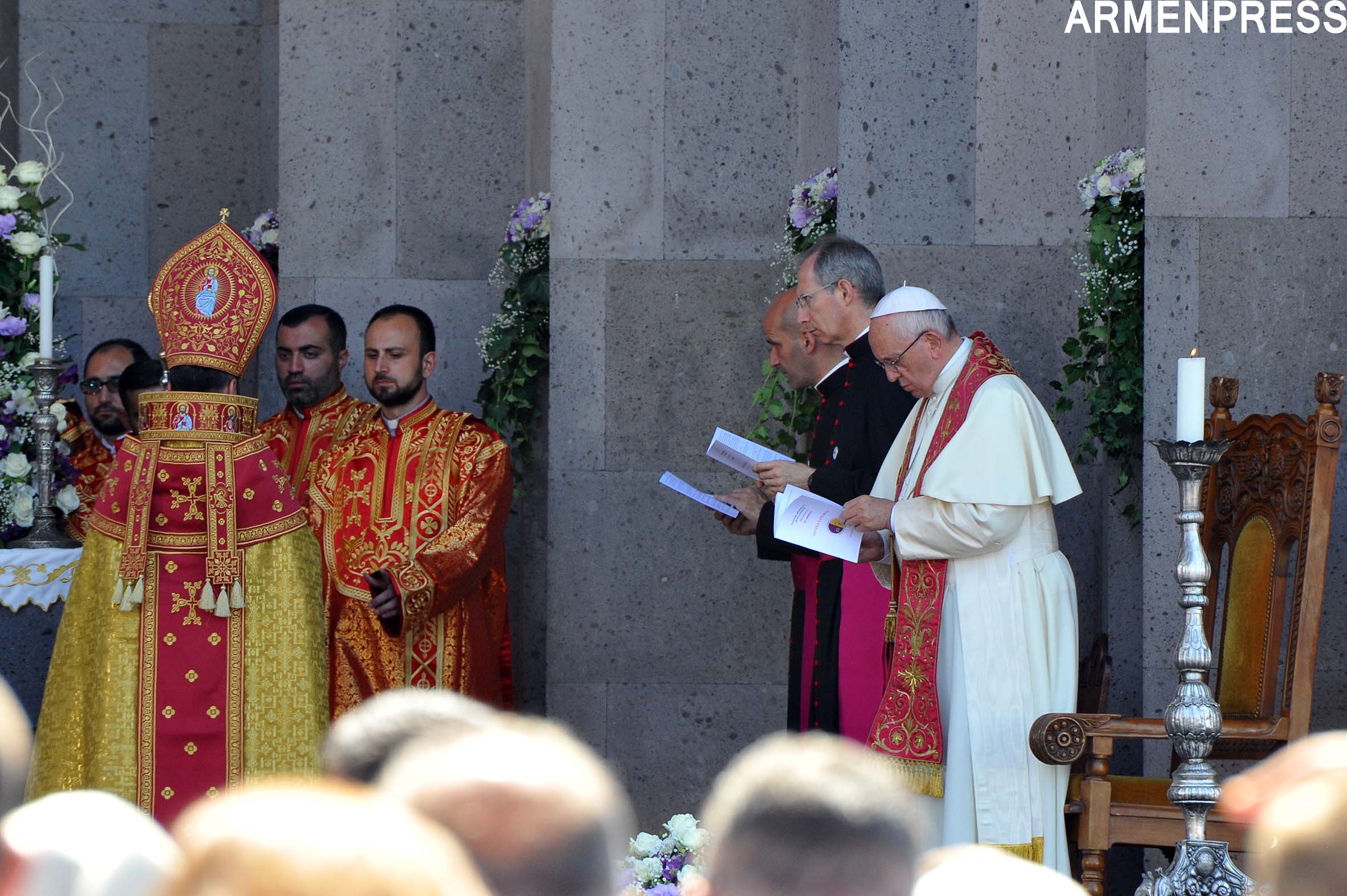 Մայր Աթոռ Սուրբ Էջմիածնում` Սբ. Տրդատի բաց խորանի առջև, այսօր տեղի ունեցավ Ն. Ս.Օ.Տ.Տ. Գարեգին Բ Ամենայն Հայոց Կաթողիկոսի ու Հռոմի Ֆրանցիսկոս Պապի համատեղ Առաջնորդական սուրբ պատարագի մատուցման արարողությունը, ինչից հետո նախատեսվում է հանդիպում Հայոց եկեղեցու պատվիրակությունների հետ, ապա`այցելություն Խոր Վիրապ: