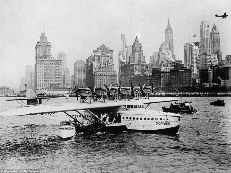 In a dramatic shot from 1931 the Dornier Do-X flew past the New York City skyline as it made its way to dock in the city