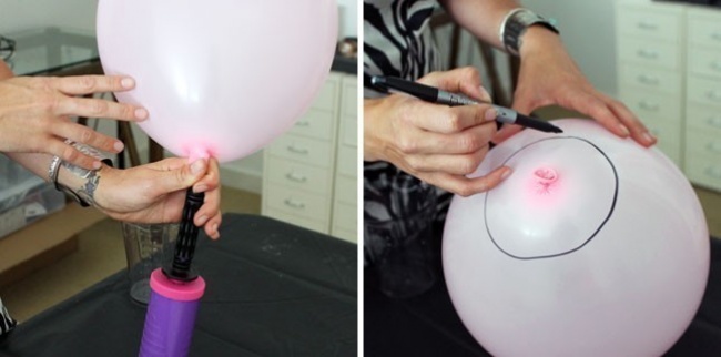 1. Առաջին հերթին փչեք փուչիկը և մարկերով նշենք այն հատվածը, որը ցուցադրված է նկարում։ Փուչիկը պետք է լինի կլոր, այլ ոչ թե ձվաձև։