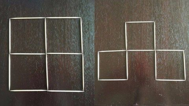 Սկզբի համար անհրաժեշտ է վերցնել 12 փայտիկ և կառուցել հետևյալ պատկերը։ Իսկ հիմա ամենահետաքրքիր մասը։ Հարկավոր է 3 գործողությամբ փոփոխել պատկերն այնպես, որ ստացվի 3 քառակուսի։