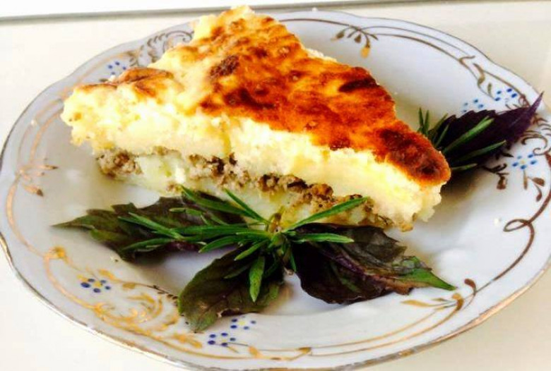 Կարտոֆիլը բաժանել 2 մասի, առաջին շերտ դնել կարտոֆիլի մի մասը այնուհետ աղացած միսը և կրկին դնել մնացած կարտոֆիլի մասը: