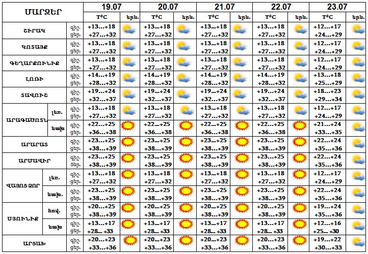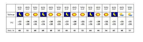 Հանրապետության տարածքում հուլիսի 19-22-ը հյուսիսային առանձին շրջաններում, 23-ին, շրջանների մեծ մասում` երեկոյան ժամերին, սպասվում է կարճատև անձրև և ամպրոպ, ամպրոպի ժամանակ‵ քամու ուժգնացում‵ 17-22 մ/վ արագությամբ: